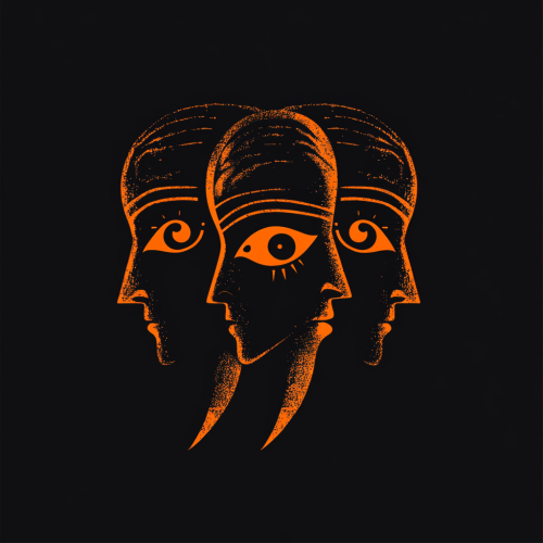 a 2/3 flag with the stylised greek Furies, Alecto, Megaera and Tisiphone. Only their heads are visible, emphasis on their eyes which are plain orange. Inspired by the style of the ancient bell-krater yet futuristic. Orange drawing and black background. minimalistic design.