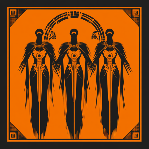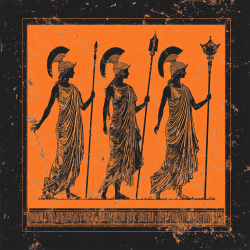 a martian flag with the stylised ancient greek Furies, Alecto, Megaera and Tisiphone. Inpired by the style of the ancient bell-krater yet futuristic. Orange and black.