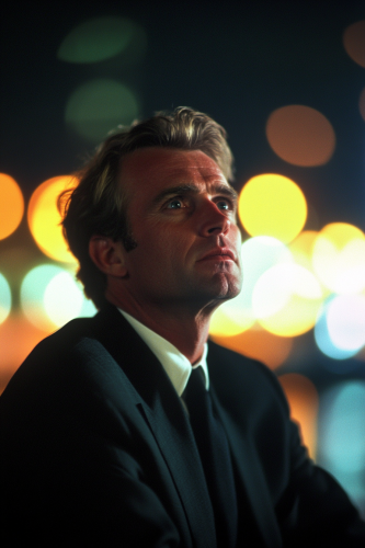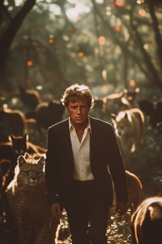 dynamic movie still of old RFK Jr., old Robert F. Kennedy Jr., photo real, with animals, animals surrounding, shot on arriflex 35, 35mm, pivotal scene, dramatic, photo real, retro, 1980s, bright, photorealistic, wide angle, sharp focus, ultra realistic, ultra detailed, cinematic lighting, photographic, Eastman Kodak Color Negative film 5251 50T shot on panavision super ps, Polaroid 3200dpi scan medium format film Portra 800 --ar 2:3