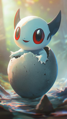 A chibi-style rendering of an adult Mime Jr. Pokémon emerging from a large egg. Mime Jr. should have a cute, exaggerated look with large, expressive eyes and a small, round body. The scene features bright, playful colors and soft, cartoonish lighting. The environment captures a close-up view of Mime Jr. hatching, with a whimsical background and a slight blur for depth of field --ar 9:16