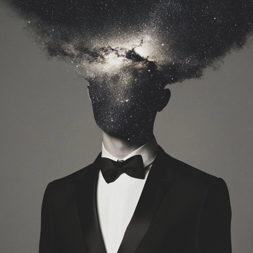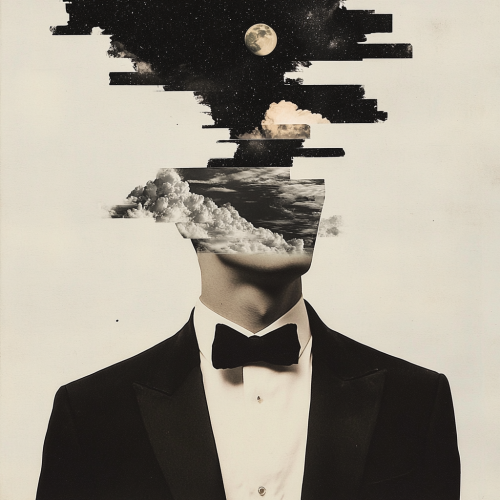 A minimalist and surreal collage featuring a handsome man in a tuxedo, with his head split into abstract collage pieces, floating above his neck, the Milky Way is showing radiating from the split. The fashion style is reminiscent of Yves Saint Laurent, with award-winning photography, bright lighting, and elements of surrealism and minimalism.