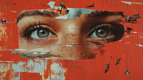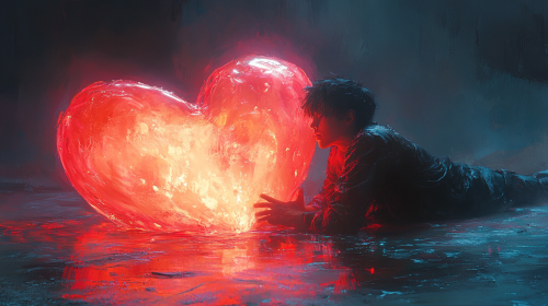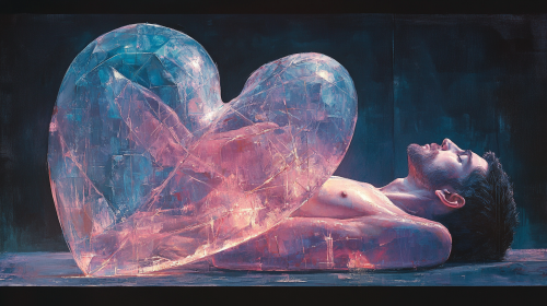 A large heart-shaped sculpture with its pointed bottom pressing down on a man's chest as he lies beneath it. The man is lying on his back, with the tip of the heart piercing his chest, symbolizing emotional pressure. The art style is collage-like, with layered textures and cut-out shapes. The colors of the heart and the man are in soft pastel tones, contrasting with a dark, moody background to enhance the tension. The overall atmosphere should feel surreal and abstract. --ar 16:9 --s 750