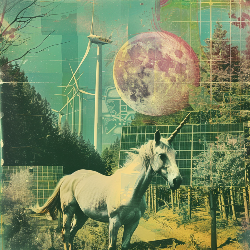 Surreal collage of wind turbines and solar panels, a magic unicorn, colorized risograph style, surreal colors, made in the style of handmade from magazine cutouts, The overall mood is surrealistic and dreamy, with a hint of mystery or fantasy. In some parts there is blurred imagery of forests, The image is in green shades, in the style of collage art, --v 6.0