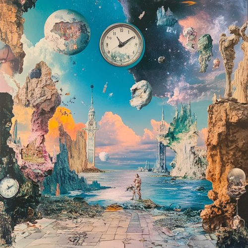 create A surrealist collage depicting dreamlike landscapes melting clocks, floating islands, and cosmic skies, with human and animal figures merging in unexpected ways. Colors are ethereal and soft, with a dreamcore aesthetic, in the style of Max Ernst