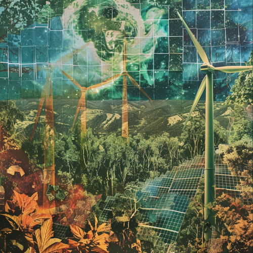 Surreal collage of wind turbines and solar panels, colorized risograph style, surreal colors, made in the style of handmade from magazine cutouts, The overall mood is surrealistic and dreamy, with a hint of mystery or fantasy. In some parts there is blurred imagery of forests, The image is in green shades, in the style of collage art, --v 6.0