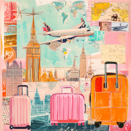 Playful retro-style travel collage featuring iconic travel symbols like luggage, maps, and landmarks, with a vibrant palette of pastel pinks, oranges, and blues.