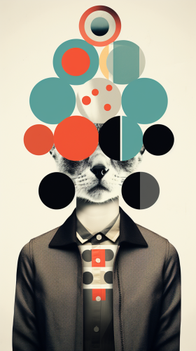 A minimalist and surreal collage featuring a handsome man in a tuxedo, with his head split into abstract pieces, floating above his neck, the 5th dimension, a3rd eye, higher level of consciousness and elements of surrealism and minimalism.