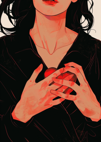 She places either hand on top of her chest and on top of her heart with the palm facing down, and places the other hand on top of her first hand with the bottom of her hand facing down. Chic illustrations, by Clavé, illustration --stop 100 --ar 91:128 --v 6.0