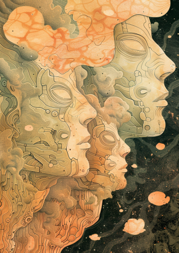 anthropomorphic humanoid creature of heads of heads playing in a kinetic futuristic environment, in the style of muted surrealism, in the style of lowbrow golden age illustrated sci-fi story covers, Ryan Heshka illustrations, Craig Gleason, landscape in the style of the signature pattern of vibration, foliage in the style of the signature pattern of discharge, weird sentient environment and flora and fauna, american works on paper 1880–1950, soft pastel colors, collage-inspired mixed media, lowbrow caricatures --ar 5:7 --v 6.0