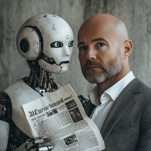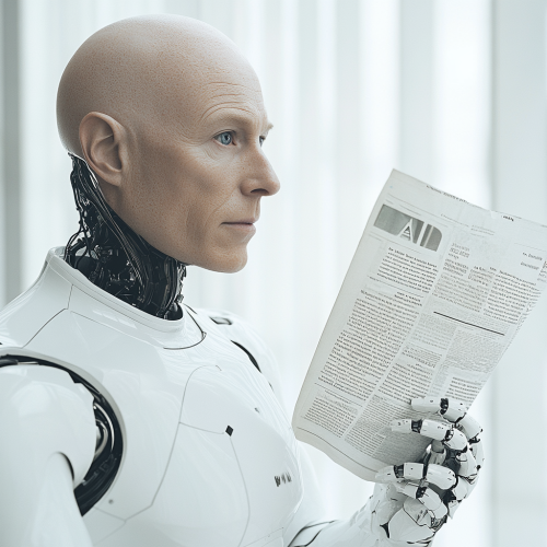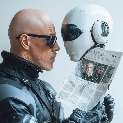 a hyper realistic photo for an AI Newletter where an AI robot gives a futuristic hologram version of a newspaper to a highly attractive bald Swedish futuristic middle aged blue eyed man white background. Nikon D850, 85mm lens, f/1.8 aperture --style raw --ar 1:1 --s 250