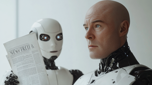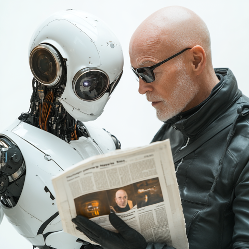 a hyper realistic photo for an AI Newletter where an AI robot gives a newspaper to a highly attractive bald Swedish futuristic middle aged blue eyed man white background --ar 16:9 --s 250