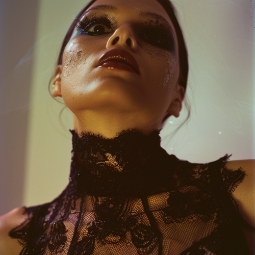 Super high fashion photography of a swedish supermodel voguing/dancing with beauty make up, gorgeous big eyes, halter neck bodycon silk lace top, high collar, shot with a 35mm wide angle lens, hipster mood using Kodak gold film for color prints, traditional fashion photography, physical world, hyperrealistic, ultrarealistic, ambient occlusion, fashion concept photography --ar 1:1 --v 6.0