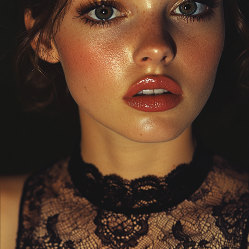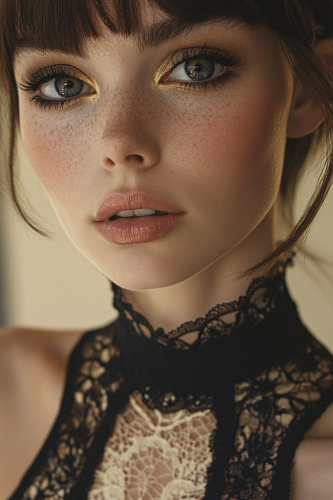 Super high fashion photography of a swedish supermodel with beauty make up, gorgeous big eyes, halter neck bodycon silk lace top, high collar, shot with a 35mm wide angle lens, hipster mood using Kodak gold film for color prints, traditional fashion photography, physical world, hyperrealistic, ultrarealistic, ambient occlusion, fashion concept photography, --s 250