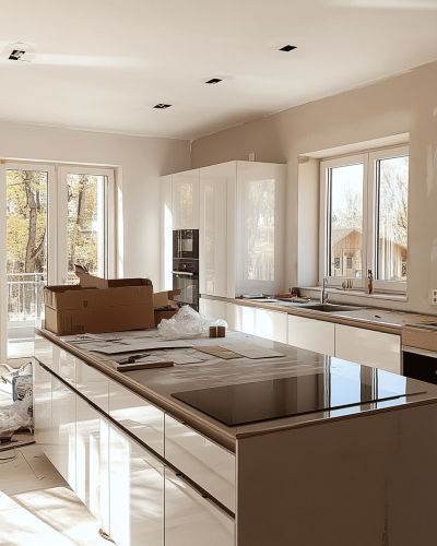 A newly renovated, modern kitchen in a Swedish villa, featuring sleek cabinetry and high-end appliances. The countertops are made of polished stone, and the kitchen has a bright, open layout with large windows allowing natural light to flood the space. The kitchen is almost finished, but there are noticeable signs of the renovation left behind. On the floor and countertops, there are small piles of leftover renovation materials, such as cardboard, plastic wrapping, and a few tools. The room feels clean and modern, but the leftover debris adds a realistic touch of a work-in-progress environment. --ar 4:5 --style raw