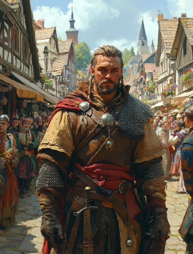 Illustration in the style of Frank Quitely, wide angle full body portrait character concept, full body figure, a Viking adventurer/thug facing the camera in a busy market square village in Sweden in high summer, from the year 1420 with period clothes and armour, expressive features, hyper realistic, Dramatic light, 32k, Full view, bright midday light, ultra realistic digital art, hyper realistic, soft rim light, octane render, volumetric lighting, dramatic light, 8k, neon ray tracing, path tracing, volumetric light, optix Cinematic post processing, cinema4d, octane render, optix, volumetric fog, global illumination, high realism. Fantasy theme. --ar 16:21 --s 250 --v 6.1