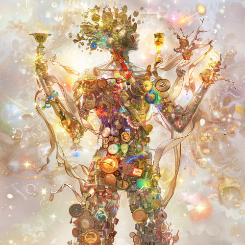 An Award Elemental in a fantasy world, depicted in a watercolor style. The humanoid figure is made up of various trophies, medals, ribbons, and plaques, all gleaming with gold, silver, and bronze hues. Its body shimmers with polished surfaces, with its limbs composed of trophies and its chest adorned with glowing medals and badges of honor. The elemental holds glowing laurel wreaths in its hands, symbolizing victory and achievement. Its eyes shine with pride and accomplishment. The background is a soft watercolor wash of golds, silvers, and blues, with sparkling stars and ribbons flowing through the air, evoking a sense of celebration and honor. --v 6.0