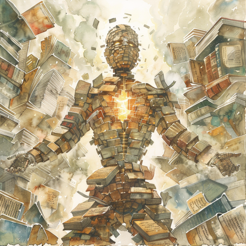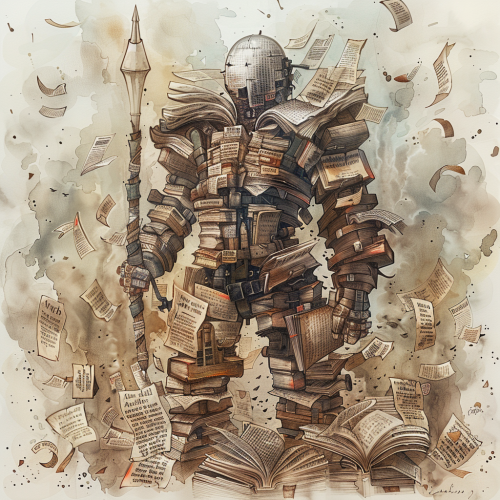 An Edition Elemental depicted as a warrior in a fantasy world, rendered in a watercolor style. The humanoid figure is composed of pages from books, newspapers, and manuscripts, with sections of its armor made from bound volumes and printed texts. Its arms and legs are wrapped in scrolls, and its chest plate is made from stacks of books. It wields a quill-shaped sword in one hand and a shield resembling a hardcover book. The elemental’s eyes glow with a sharp intellect, and its helmet is shaped like an open book. The background is a battlefield scattered with torn pages and floating text, painted in soft watercolor tones of browns, blacks, and faded ink, symbolizing knowledge and power. --v 6.0