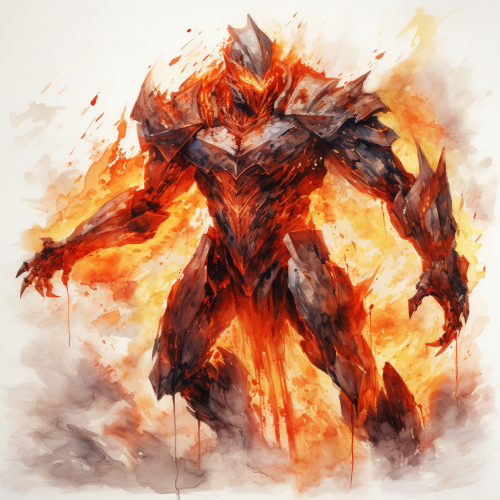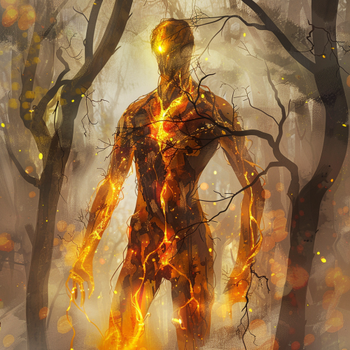 An Amber Elemental in a fantasy world, depicted in a watercolor style. The humanoid figure is composed of glowing amber resin, with its body appearing translucent and filled with ancient trapped objects like insects and plant fragments. Its form glows with warm hues of orange, gold, and yellow, with veins of pure amber running through its limbs. The surface is smooth and polished, resembling a gemstone. The elemental’s eyes shine with an intense golden light. The background is a mystical forest with amber trees and resin dripping from branches, painted in rich, warm watercolor tones, creating an ethereal and ancient atmosphere. --v 6.0
