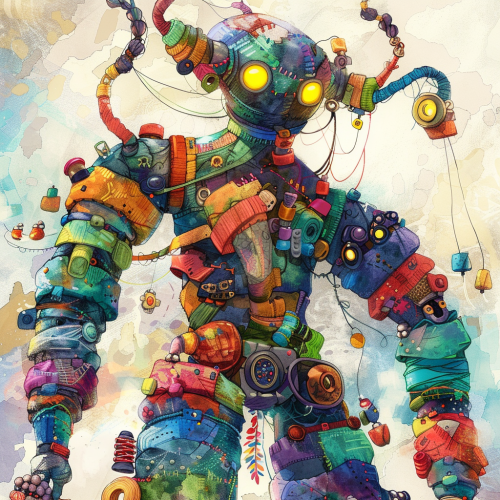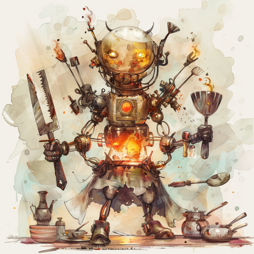 A Kitchen Elemental in a fantasy world, depicted in a watercolor style. The humanoid figure is composed of various kitchen utensils and appliances, with arms made of spatulas and ladles, legs formed from rolling pins and pots, and a torso resembling a stove with glowing burners. Its head is shaped like a mixing bowl, with glowing eyes of warm, golden light. The elemental is surrounded by floating knives, spoons, and other kitchen tools. The background features a cozy kitchen environment, with soft watercolor hues of warm reds, yellows, and browns, creating a homely and inviting atmosphere. --v 6.0