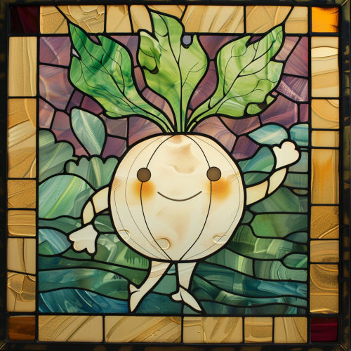 stained glass depicting an adorable turnip as an elemental bender, minimalist, cartoonish