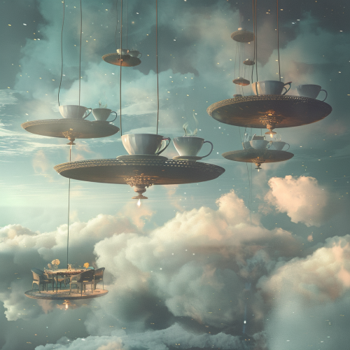 A floating café in the clouds, with tables suspended in mid-air, surrounded by swirling mist and giant coffee cups, representing the ethereal nature of dreams, escape, and whimsical imagination. Art Style: Surreal Fantasy --v 6.0