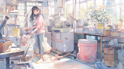 A girl cleaning with a vacuum cleaner.a detailed illustration of,watercolor, --niji --aspect 16:9