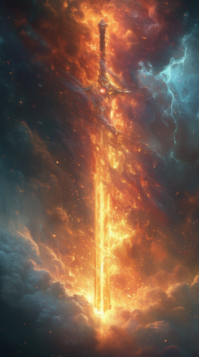 create an illustration of a weapon glowing with elemental energy fire/ice/lightning/nature swirling around, elemental and potent, coloured art by alan lee --ar 9:16 --s 750 --v 6.0 --style raw