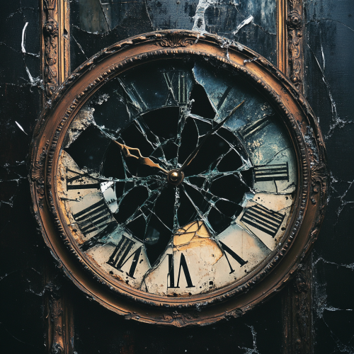 An album cover showcasing a broken clock or shattered mirror, symbolizing the passage of time and introspection. Use dark, muted tones and a sense of surrealism to evoke the feeling of 'Spare Me.' Incorporate subtle hints of anguish or longing.