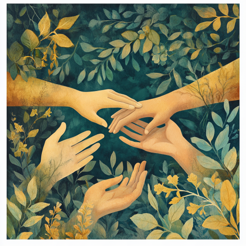 Create album art for the song 'Show More Care'. The design should evoke a sense of compassion, empathy, and tenderness. Use a soothing color palette with gentle blues, soft greens, and warm neutrals. Incorporate imagery that symbolizes care and kindness, such as hands gently holding something precious, a warm embrace, or a comforting scene in nature. The style should be warm and inviting, conveying the importance of showing care and consideration in every aspect of life.