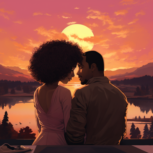 lofi aesthetic album cover, man overlooking the sunset with his wife who has a big brown afro, warm and pink tones