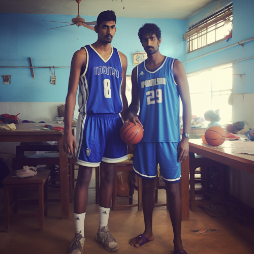 phone photo of a 7 feet tall basketball player from Kerala standing in basketball jersey next to short friend