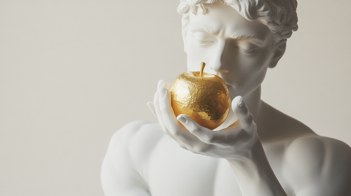 In the foreground a Greek man is hiding a golden apple in his hands. The man is a matte white ceramic textured statue. the background is white --ar 16:9