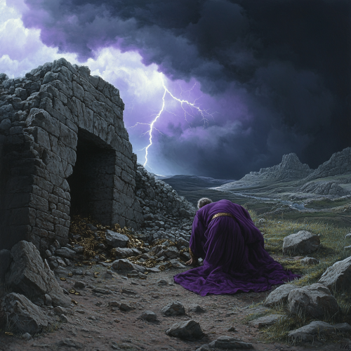 Ancient man stealing gold, silver and purple robes to hid in a hole in the ground as stone walls of Jericho crumbles in the background. Hyperrealistic. Dark skies lightening and thunder