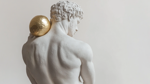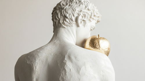 In the foreground, a Greek man has his back turned, hiding a golden apple. The man is a matte white ceramic textured statue. the background is white --ar 16:9