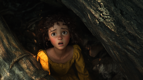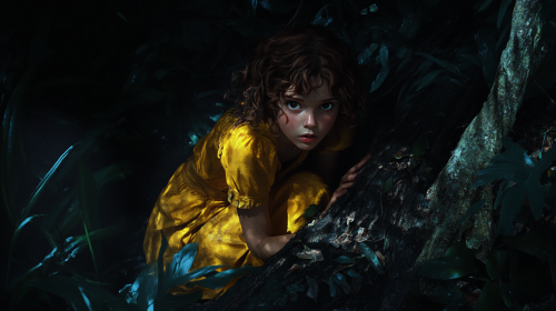 Sally, a young girl with curly brown hair, crouched in a small, dark space beneath a fallen tree trunk in the dense jungle at night. Her yellow dress is slightly dirty from hiding, and her expression is one of confusion and fear as she looks around in the shadows. The space is tight and dimly lit by the faint glow of moonlight filtering through the dense canopy above. The surrounding jungle is dark, with thick foliage and eerie shadows, creating a sense of isolation and tension. Animated style, with ultra-realistic details capturing Sally's emotions and the mysterious, confined atmosphere. Animated, ultra realistic,. --ar 16:9