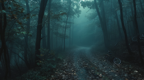 For a 'Stranger Things'-inspired scene set in a forest during the 80s, imagine a dense, misty woodland at twilight. The trees cast long, eerie shadows under the soft, diffused light of the setting sun. A path winds through the forest, lined with old-fashioned bikes, hinting at the presence of adventurous kids. The atmosphere is mysterious and suspenseful, yet the lighting remains even and gentle, ideal for creating an intriguing backdrop without the need for complex editing, and allowing space for characters to be added seamlessly into the scene. --s 500 --style raw --ar 16:9 --v 6.0