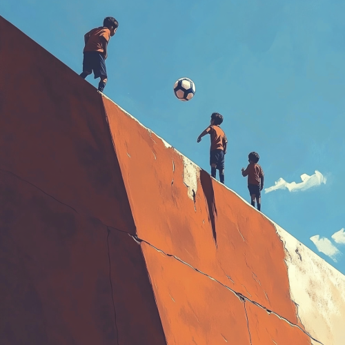 criar uma imagem estilizada, como se fosse um cartoom com Três pessoas de diferentes alturas tentando olhar uim jogo de futebol por cima doe um muro. A pessoa mais alta consegue ver facilmente por cima do muro, pois está sobre uma caixa alta. A pessoa de altura média tem uma caixa um pouco menor, e só consegue ver parte do jogo. A pessoa mais baixa está sobre uma caixa bem pequena e não consegue ver nada.