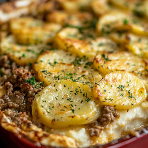 "Create a close-up image of tender, slow-cooked ribeye steaks covered in a rich, savory sauce. The steaks should be about 2-3 lbs, showcasing a deep brown color with visible marbling and texture, glistening from the flavorful sauce. The dish should have hints of green garnishes (like chives or parsley) for color contrast. Serve the ribeye steaks on a white plate with a few sliced, seasoned potatoes on the side. The lighting should be warm to highlight the depth of color in the meat and sauce, giving a cozy, hearty feel