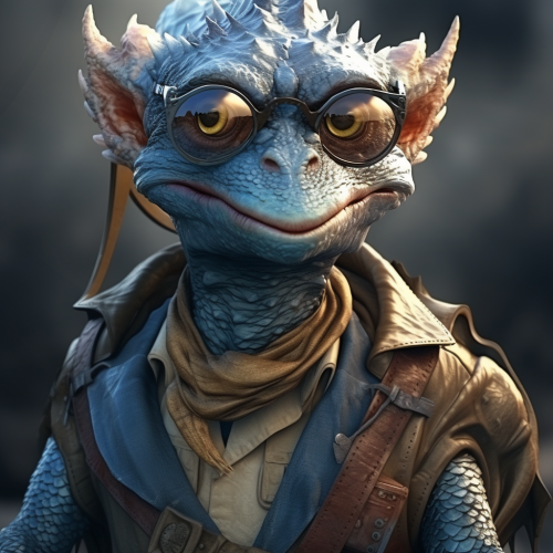 A little dragon goblin with blue skin, hybrid, glasses, medieval fantasy, comic book style