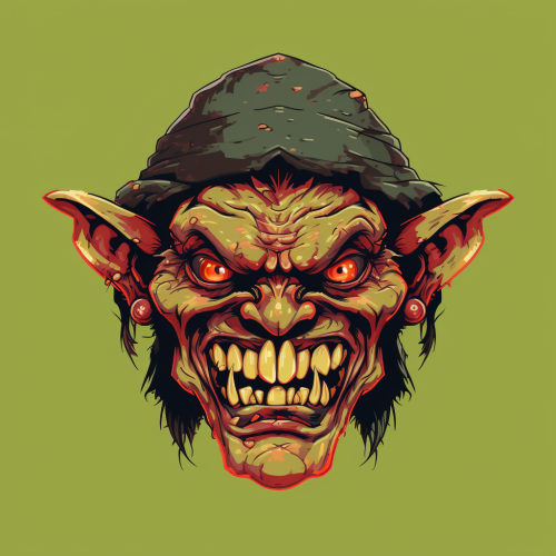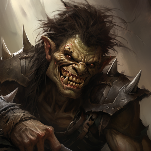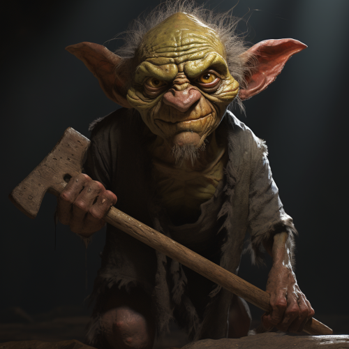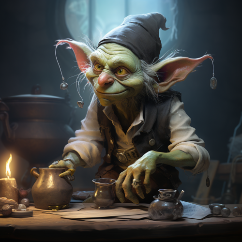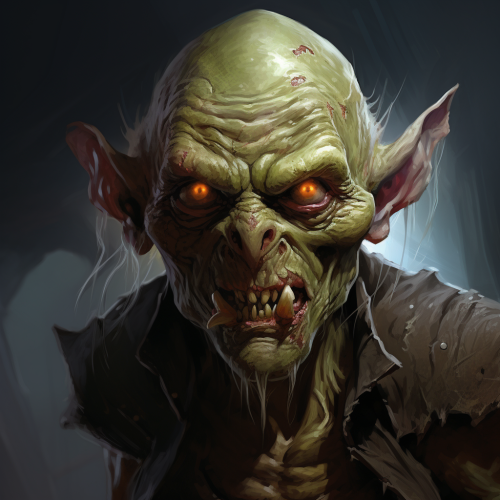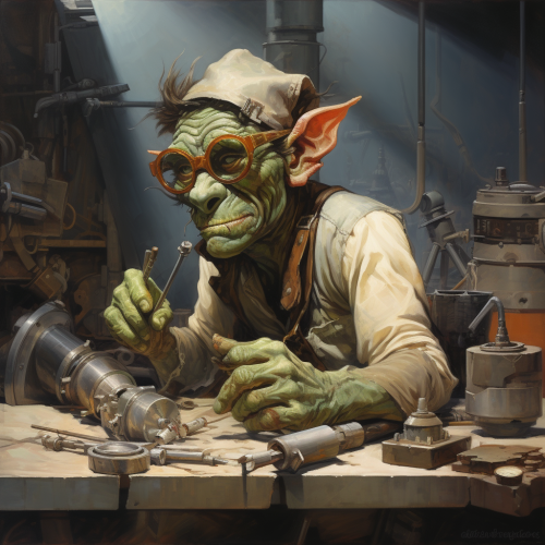 in frazetta style:Goblin inventor large glasses dull green/grey in skin color sickly thin long spindly fingers barefoot wears a machinist’s apron Lemme think on it more but thats a start Maybe a welder’s mask propped up on top of the old noggin