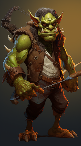 Character of a goblin, holding a crossbow, mustache in the style of Hulk Hogan, in the style of Wayne Reynolds, Daren Bader --ar 9:16