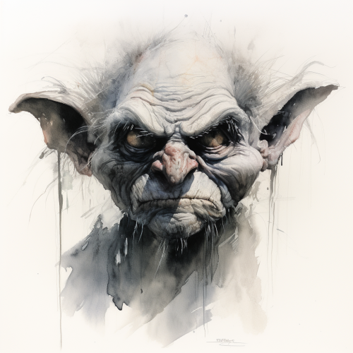grumpy looking Goblin, angry, black and white watercolor, Stephen Gammell Style,