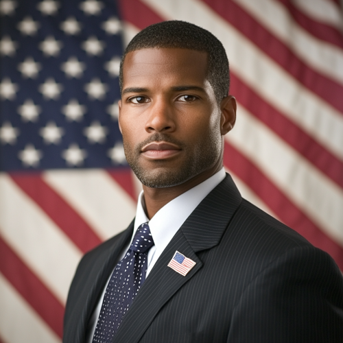 a american male of 42 years old who is intelligent, charismatic and a Mayor, american flag at the background photo taken in 2006 so the quality is not the best