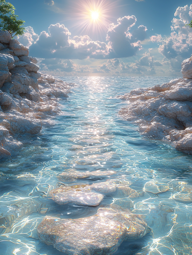beautiful realistic nature view with beautiful water and beautiful blue sky and a lovely sun with good vibe, ultra realistic, a nice way of stones --v 6.1 --q 2 --stylize 1000 --ar 3:4