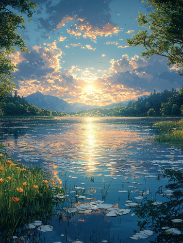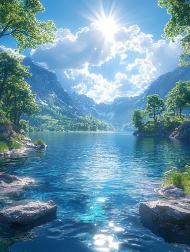beautiful realistic nature view with beautiful water and beautiful blue sky and a lovely sun with good vibe, ultra realistic, --v 6.1 --q 2 --stylize 1000 --ar 3:4