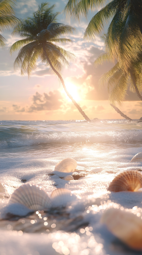 sunlight, coconut trees, floating water, foam, seashells, large area of white space, translucent, ultra-detailed, clean and refreshing design, high resolution, 4K, HD, --ar 9:16