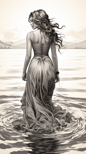 classic drawing line art illustration, black and white, maiden in open back sun dress, female, long hair, walking in water, camera angle from behind, graceful, elegant --ar 9:16 --s 750 --v 5.2