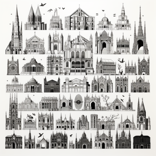 black and white grid of cartoon temples, churches, cathedrals, shrines