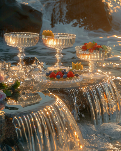 , the table and chairs are glass and holographic sparkling in the sun on the beach, in the middle of the table is a big glass drink waterfall filled with water and flowers, a stunning majestic plate of appetizers including fruits like strawberries blueberries and mangos are cut into creative shapes , sparkles, cinematic lighting, ethereal details,snapshot aesthetic,dreamlikenaturaleza, neon hallucinations, Kodak aerochrome, light white, shooting photography for magazine cover , Canon lens 85mm 1.2f, dramatic lighting, Master pieces, 8k UHD, Photorealistic, Hyper detail, neon hallucinations, kodak aerochrome, ethereal, dreamy, vaporwave, soft focal points --chaos 10 --ar 4:5 --stylize 400 --v 6.0
