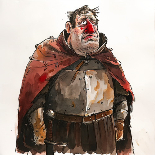 a slightly fat medieval mayor. he has a red bruise in the shape and size of a hoof on his face, on his nose and mouth. the nose is broken and a few incisors are missing. he stands a little hunched over. Medival, ink painting --v 6.0